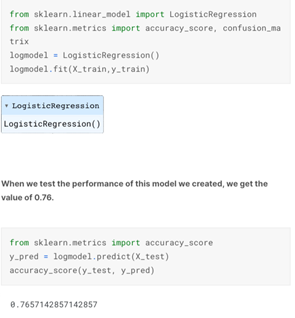 Logistic regresyon bir sınıflandırma yöntemidir ve bir şeyin iki kategoriden birine ait olup olmadığını tahmin etmek için kullanılır. Bu yöntemi karaciğer hastalığını tahmin etmek için de kullanacağız. Lojistik Regresyon sonucumuz 0.76’dır (Şekil 15)