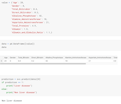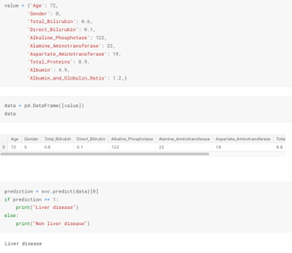 Sonuç olarak Şekil 16’da SVC yöntemi ile verdiğimiz değerlere göre hastamızda karaciğer hastalığı olduğu gözükmektedir. Şekil 17’de ise hastamızda karaciğer hastalığı bulunmuyor