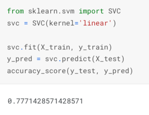 SVC (Support Vector Classification) makine öğrenmesinde sınıflandırma problemleri için kullanılan bir algoritmadır. SVC yöntemi ile veri setimizin skorunun 0,77 olduğunu görüyoruz. Bu durumda tahminlemeyi SVC yöntemi ile yapacağım.